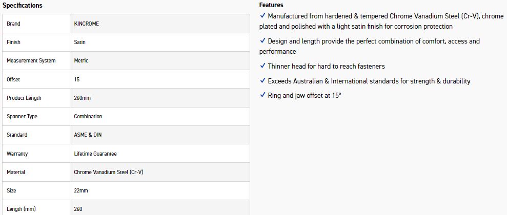 KINCROME CM22C 22MM COMBO SPANNER (SATIN)