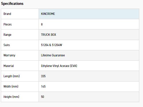 Kincrome EVA Trays have been specifically designed to protect and maintain your Kincrome Professional Quality Tools®. These tool trays are custom made to suit Kincrome Tool Chests and Boxes. Kincrome EVA Trays make selection of your tools easier and quicker – saving you valuable time.