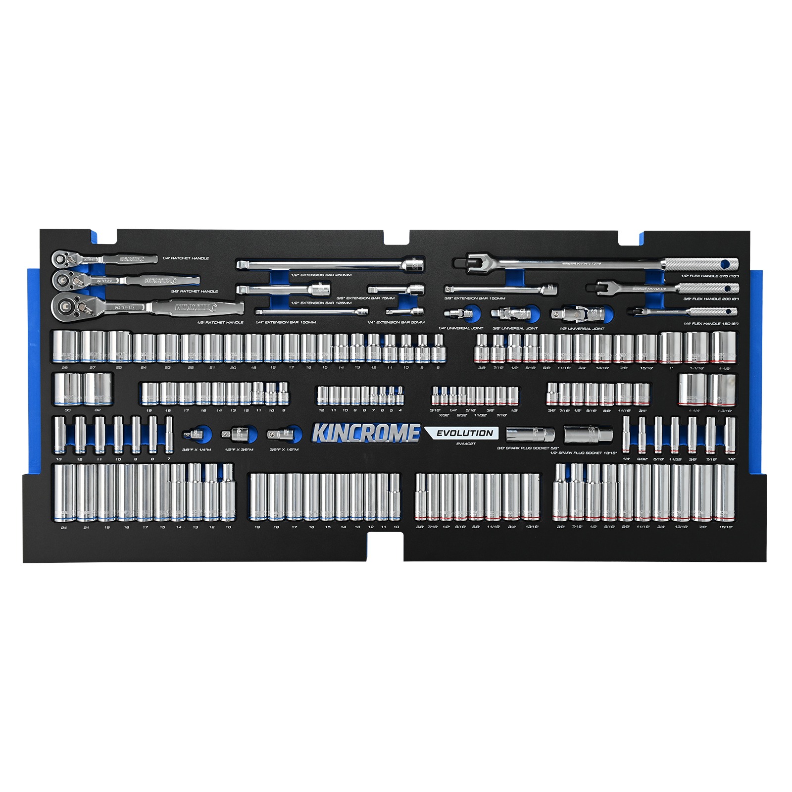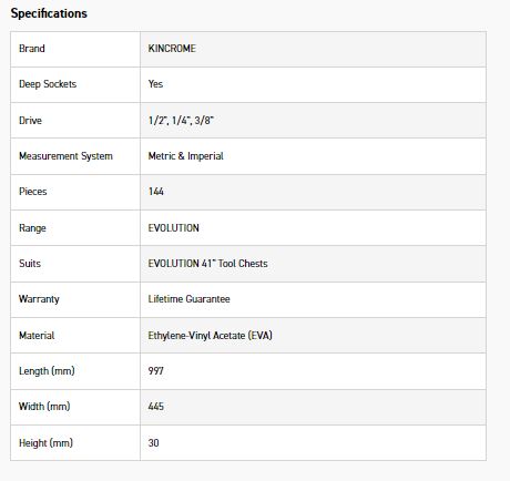 • 22 Sockets 1/2” Square Drive: 8, 9, 10, 11, 12, 13, 14, 15, 16, 17, 18, 19, 20, 21, 22, 24, 25, 27, 28, 30, 32mm
