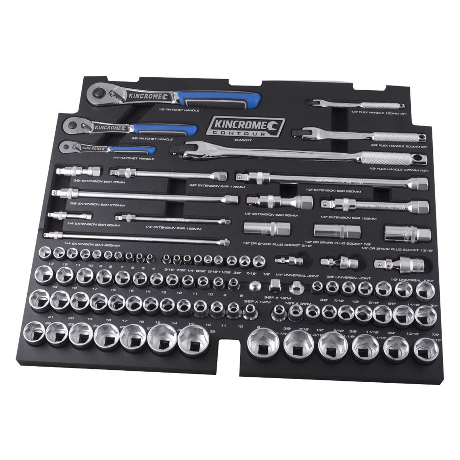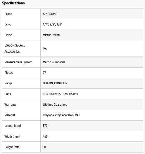 • 15 LOK-ON™ Sockets 1/2”Square Drive: 3/8, 7/16, 1/2, 9/16, 5/8, 11/16, 3/4, 13/16, 7/8, 15/16, 1, 1.1/16, 1.1/8, 1.3/16, 1.1/4”