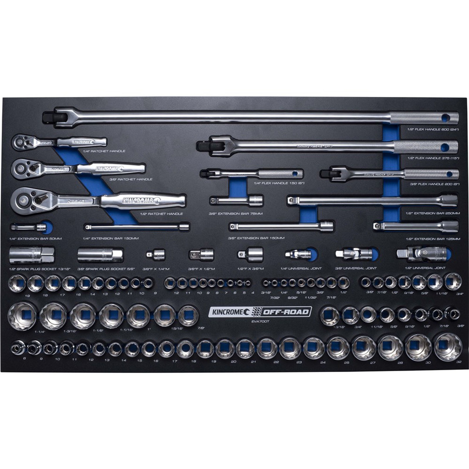• 15 Sockets 1/2” Square Drive: 3/8, 7/16, 1/2, 9/16, 5/8, 11/16, 3/4, 13/16, 7/8, 15/16, 1, 1.1/16, 1.1/8, 1.3/16, 1.1/4”
