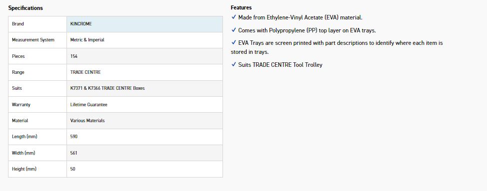 EVA Trays are screen printed with part descriptions to identify where each item is stored in trays.