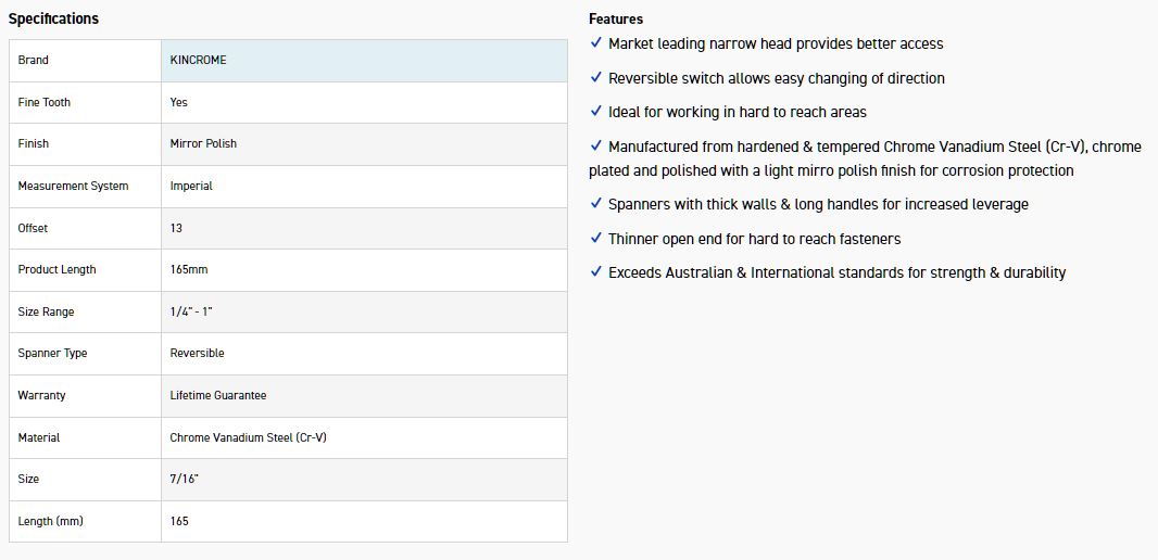 The Kincrome reversible gear spanner has all the benefits of standard spanners and more. The strong fine gear ratcheting ring end needs as little as 2.5° of sweep to move the fastener, a standard fixed ring end needs a minimum of 30°, or 12 times the area. Kincrome Gear Spanner ratcheting ring end has a Peripheral Drive™ configuration that virtually eliminates the rounding off of fasteners. The market leading narrow and thin head, combined with fine gear tooth design makes the Kincrome gear spanner suitable for working in tight and hard to access areas where a ratchet and socket will not fit. The reversible mechanism allows you to change the direction of the gears via the switch, and the 13° offset mimics the characteristics of a conventional combination spanner.