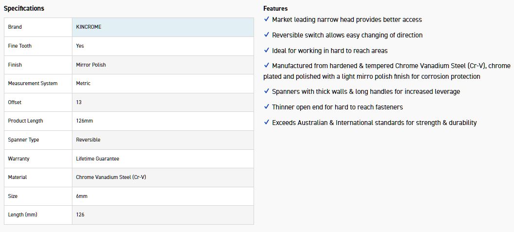 The Kincrome reversible gear spanner has all the benefits of standard spanners and more. The strong fine gear ratcheting ring end needs as little as 2.5° of sweep to move the fastener, a standard fixed ring end needs a minimum of 30°, or 12 times the area. Kincrome Gear Spanner ratcheting ring end has a Peripheral Drive™ configuration that virtually eliminates the rounding off of fasteners. The market leading narrow and thin head, combined with fine gear tooth design makes the Kincrome gear spanner suitable for working in tight and hard to access areas where a ratchet and socket will not fit. The reversible mechanism allows you to change the direction of the gears via the switch, and the 13° offset mimics the characteristics of a conventional combination spanner.