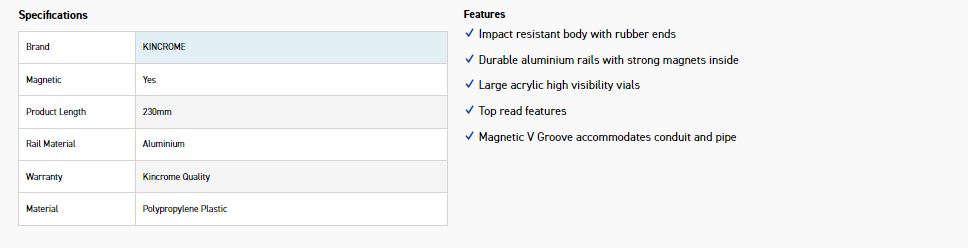 The Kincrome Torpedo Level is the ideal spirit level for any worksite job. With magnetic sides and rubber bumpers, it sticks to any metal surface without causing damage. Complete with three spirit vials it is the perfect spirit level for any trade application.