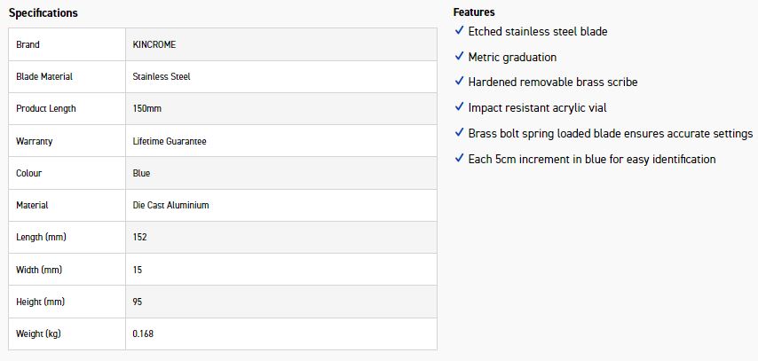 The Kincrome Combination Squares include etched stainless steel blades with each 5cm increment in blue for easy identification. The Combination Squares also feature an easy read vial, brass hardware with the options of die cast and plastic versions available. It also has a convenient scriber pin with on-board storage, so you can measure and mark your job straight away.