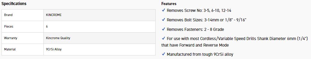 Kincrome kwik-outs are manufactured from tough 9CrSi alloy steel and are designed to remove screws, bolt sizes and other standard fasteners. Packaged in a convenient blow mould case, the set contains 6 screw & bolt removers.