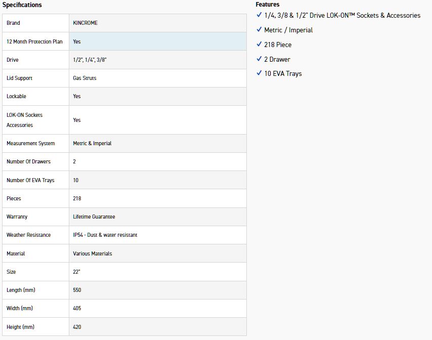 • 15 LOK-ON™ Sockets 1/2” Square Drive: 3/8, 7/16, 1/2, 9/16, 5/8, 11/16, 3/4, 13/16, 7/8, 15/16, 1, 1.1/16, 1.1/8, 1.3/16, 1.1/4”