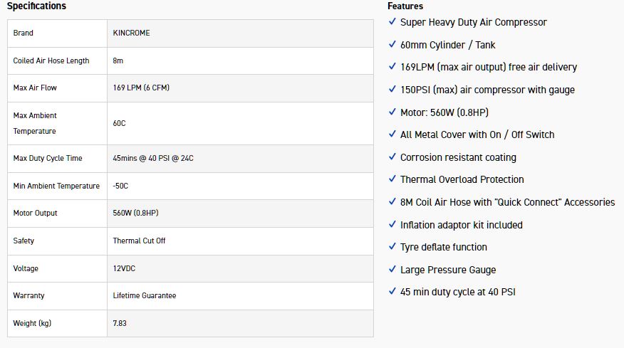 No matter what or where the adventure, Kincrome has you covered! Whether your camping, hunting, fishing or 4WDing, The Kincrome RANGER PRO 12V Air Compressor is a MUST HAVE for the outdoor adventurer. With a powerful 560W motor and a MASSIVE 169 Litres Per Minute of free air delivery, it will inflate your tyres and other inflatables such as sporting equipment FAST and with ease. The unit comes with a sturdy threaded valve connector and 8M coiled air hose, a large PSI gauge for easy indication of pressure and a tyre deflator button, making it ideal when 4WDing. It also comes equipped with heavy duty terminal clamps, a replaceable air filter and a thermal overload protection which will automatically turn the compressor OFF until it is has cooled down to a safe operating temperature. A needle adaptor is included to inflate the families sporting equipment, presta-valve adaptor for bicycles tyres and two high adaptors for inflatables such as pool lilos and camping mattresses. All of this is stored conveniently in a heavy duty storage bag, allowing for easy storage in the boot, or back of the Ute. Ldeal for 4×4, Cars, Caravans, Trailers, Motorbikes, Sporting Equipment & Inflatables.