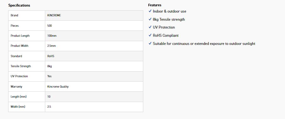 Kincrome offer a comprehensive range of high tensile, UV stabilised cable ties in various sizes in black and natural colours, all manufactured from 66UL approved Nylon. In addition, Kincrome offers the convenience and safety of marker ties for easy cable identification, resealable ties that can be re-used over and over again, stainless steel ties for automotive and marine applications, as well as the revolutionary self-cut ties, all in various sizes. This comprehensive offering is one that will suit all users with over 60 different options in pack sizes ranging from 10 to 500 Pieces. Kincrome is your one stop supplier for all your cable management requirements.