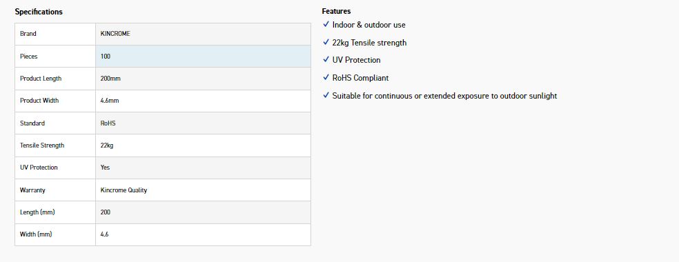 Kincrome offer a comprehensive range of high tensile, UV stabilised cable ties in various sizes in black and natural colours, all manufactured from 66UL approved Nylon. In addition, Kincrome offers the convenience and safety of marker ties for easy cable identification, resealable ties that can be re-used over and over again, stainless steel ties for automotive and marine applications, as well as the revolutionary self-cut ties, all in various sizes. This comprehensive offering is one that will suit all users with over 60 different options in pack sizes ranging from 10 to 500 Pieces. Kincrome is your one stop supplier for all your cable management requirements.