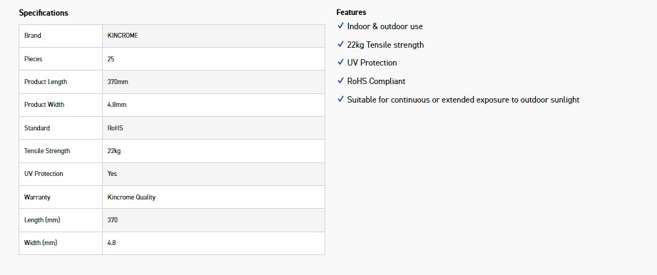 Kincrome offer a comprehensive range of high tensile, UV stabilised cable ties in various sizes in black and natural colours, all manufactured from 66UL approved Nylon. In addition, Kincrome offers the convenience and safety of marker ties for easy cable identification, resealable ties that can be re-used over and over again, stainless steel ties for automotive and marine applications, as well as the revolutionary self-cut ties, all in various sizes. This comprehensive offering is one that will suit all users with over 60 different options in pack sizes ranging from 10 to 500 Pieces. Kincrome is your one stop supplier for all your cable management requirements.