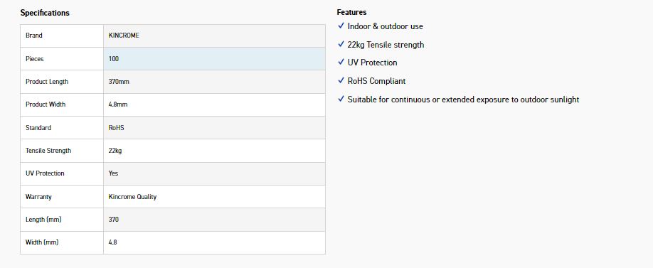 Kincrome offer a comprehensive range of high tensile, UV stabilised cable ties in various sizes in black and natural colours, all manufactured from 66UL approved Nylon. In addition, Kincrome offers the convenience and safety of marker ties for easy cable identification, resealable ties that can be re-used over and over again, stainless steel ties for automotive and marine applications, as well as the revolutionary self-cut ties, all in various sizes. This comprehensive offering is one that will suit all users with over 60 different options in pack sizes ranging from 10 to 500 Pieces. Kincrome is your one stop supplier for all your cable management requirements.