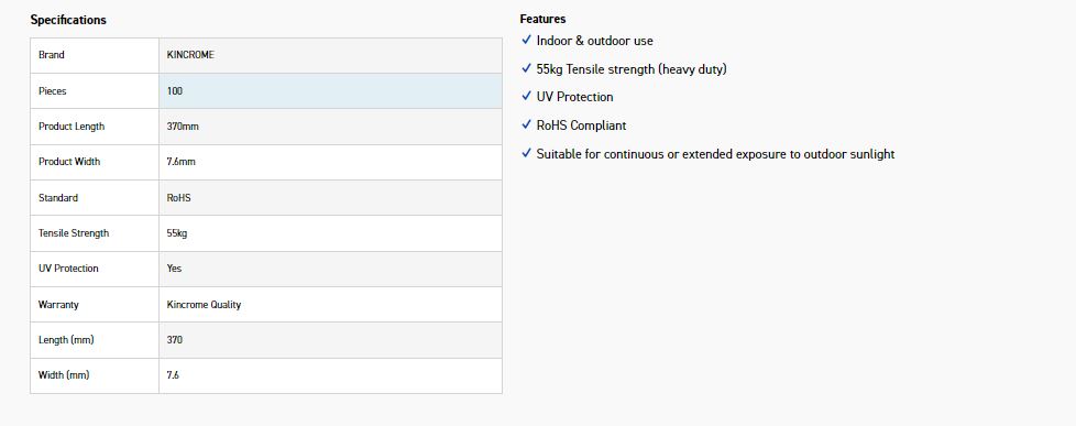 Kincrome offer a comprehensive range of high tensile, UV stabilised cable ties in various sizes in black and natural colours, all manufactured from 66UL approved Nylon. In addition, Kincrome offers the convenience and safety of marker ties for easy cable identification, resealable ties that can be re-used over and over again, stainless steel ties for automotive and marine applications, as well as the revolutionary self-cut ties, all in various sizes. This comprehensive offering is one that will suit all users with over 60 different options in pack sizes ranging from 10 to 500 Pieces. Kincrome is your one stop supplier for all your cable management requirements.