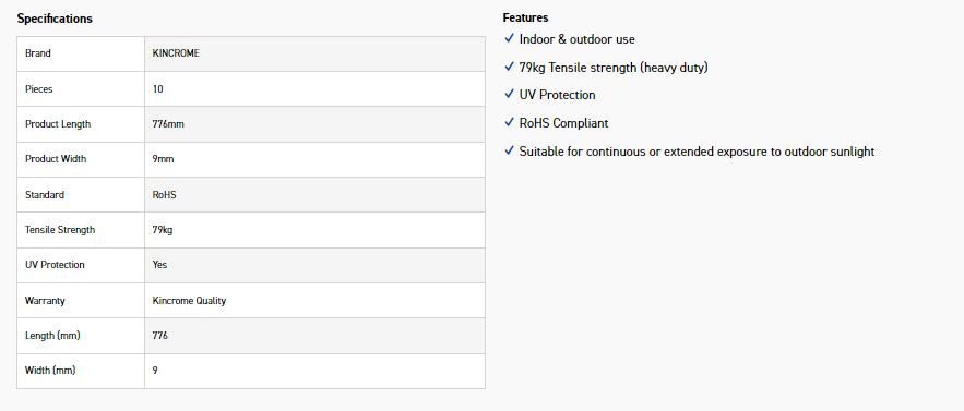 Kincrome offer a comprehensive range of high tensile, UV stabilised cable ties in various sizes in black and natural colours, all manufactured from 66UL approved Nylon. In addition, Kincrome offers the convenience and safety of marker ties for easy cable identification, resealable ties that can be re-used over and over again, stainless steel ties for automotive and marine applications, as well as the revolutionary self-cut ties, all in various sizes. This comprehensive offering is one that will suit all users with over 60 different options in pack sizes ranging from 10 to 500 Pieces. Kincrome is your one stop supplier for all your cable management requirements.