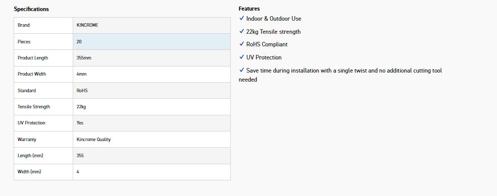 Kincrome offer a comprehensive range of high tensile, UV stabilised cable ties in various sizes in black and natural colours, all manufactured from 66UL approved Nylon. In addition, Kincrome offers the convenience and safety of marker ties for easy cable identification, resealable ties that can be re-used over and over again, stainless steel ties for automotive and marine applications, as well as the revolutionary self-cut ties, all in various sizes. This comprehensive offering is one that will suit all users with over 60 different options in pack sizes ranging from 10 to 500 Pieces. Kincrome is your one stop supplier for all your cable management requirements.