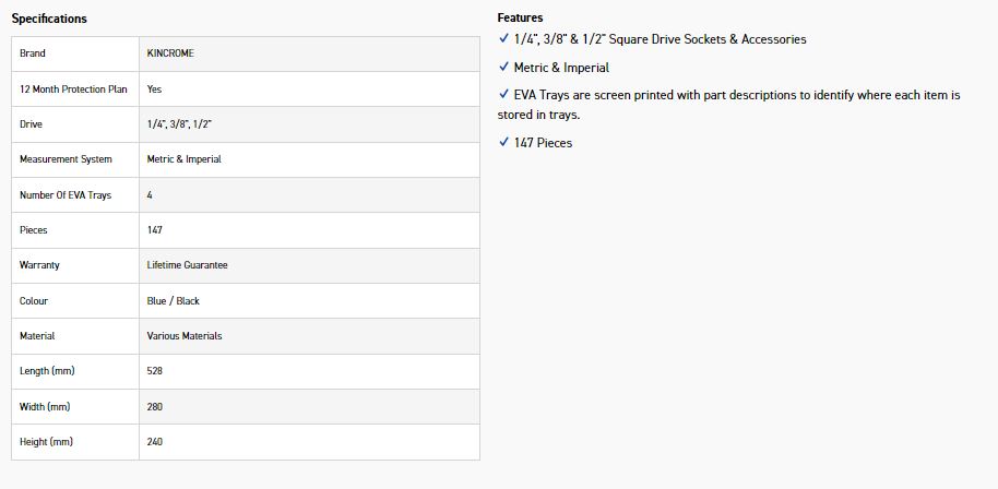 • 11 Sockets 1/2” Square Drive: 3/8, 7/16, 1/2, 9/16, 5/8, 11/16, 3/4, 13/16, 7/8, 15/16, 1”