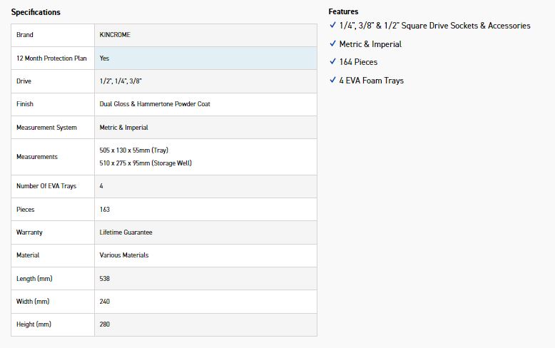 • 11 Imperial Sockets 1/2” Square Drive: 3/8, 7/16, 1/2, 9/16, 5/8, 11/16, 3/4, 13/16, 7/8, 15/16, 1”