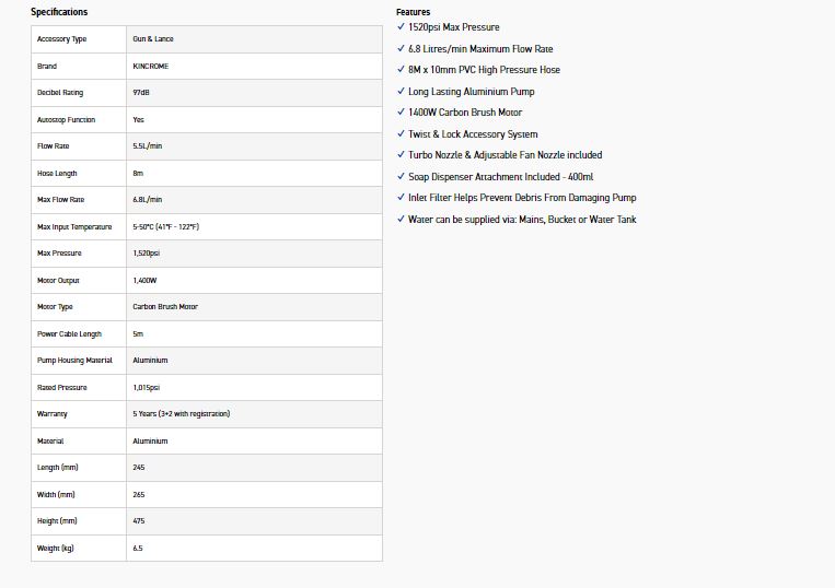 Discover the K16250 1400W Electric Pressure Washer, your ultimate companion for efficient and powerful cleaning. With a maximum pressure of 1,520 PSI and a dependable 1,015 PSI rated pressure, it’s designed to excel in various cleaning tasks. The 6.8 LPM maximum flow rate ensures thorough and swift cleaning, while the robust 1,400W carbon brush motor guarantees consistent performance.