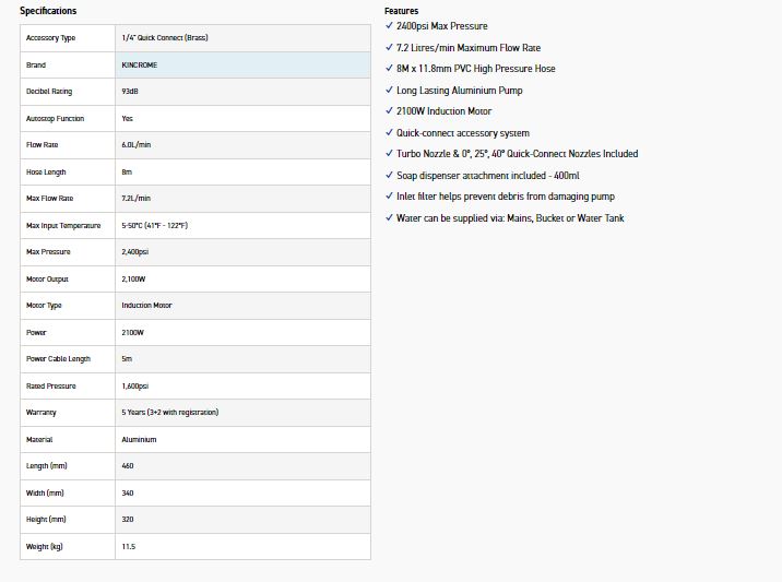 KINCROME K16253 ELEC PRESSURE WASHER 2100W