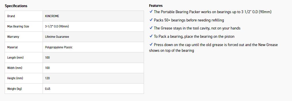 With the large, transparent and impact resistant Grease Cup, this unit is capable of repacking grease into 50 or more bearings, before needing to be refilled. You can fill the Grease Cup via bulk filling, or via the grease nipple on the bearing shaft retainer. The original method of packaging grease into a bearing is extremely messy and wastes a lot of grease too, however the Kincrome Professional Bearing Packer has solved this problem! The unit is extremely easy to operate, simply remove the plunger cone and fit the bearing over the bearing retainer shaft. Reinstall the plunger cone and press down with force or use a bench vice to push the fresh grease through your bearing while also removing the old grease…. it’s that simple!