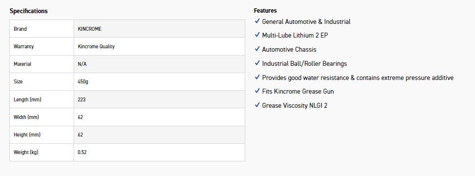 Kincrome General Purpose Grease is an NLGI2 lithium grease suitable for automotive chassis lubrication, industrial ball and roller bearings under high load. It provides good weather resistance and contains extreme pressure and anti-wear additives. Never mix greases, always flush or clean old grease out before adding new grease.