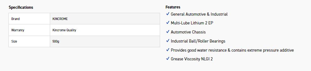 Kincrome General Purpose Grease is an NLGI2 lithium grease suitable for automotive chassis lubrication, industrial ball and roller bearings under high load. It provides good weather resistance and contains extreme pressure and anti-wear additives. Never mix greases, always flush or clean old grease out before adding new grease