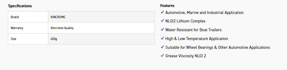 Kincrome Hi-Temp Bearing Grease is a NLGI2 lithium complex, high temperature grease which is recommended for wheel bearings (including disc brakes), automotive, earth moving, marine and industrial applications. It is also suitable for ball, roller, needle and slow-speed plain bearings, as well as operating under all service conditions including low temperature applications if needed. Never mix greases, always flush or clean old grease out before adding new grease.