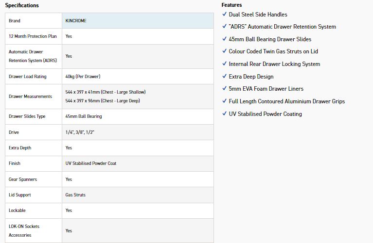 CONTOURĀ® storage comes standard with a range of premium features, including; the chamfered screen printed Kincrome side panels, ’Automatic Drawer Retention System (ADRS)’ locking system, heavy duty steel side handles, side folding work trays (including magnetic power boards), stainless steel worktops & heavy duty swivel castors for easy manoeuvrability.