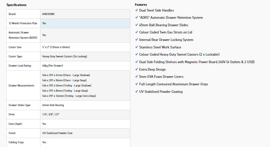 CONTOURĀ® storage comes standard with a range of premium features, including; the chamfered screen printed Kincrome side panels, ’Automatic Drawer Retention System (ADRS)’ locking system, heavy duty steel side handles, side folding work trays (including magnetic power boards), stainless steel worktops & heavy duty swivel castors for easy manoeuvrability.