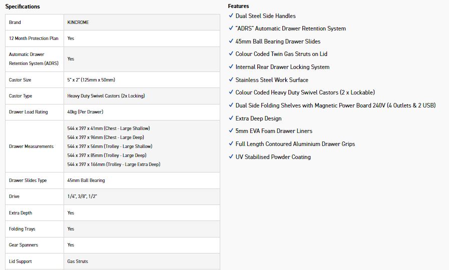 CONTOURĀ® storage comes standard with a range of premium features, including; the chamfered screen printed Kincrome side panels, ’Automatic Drawer Retention System (ADRS)’ locking system, heavy duty steel side handles, side folding work trays (including magnetic power boards), stainless steel worktops & heavy duty swivel castors for easy manoeuvrability.