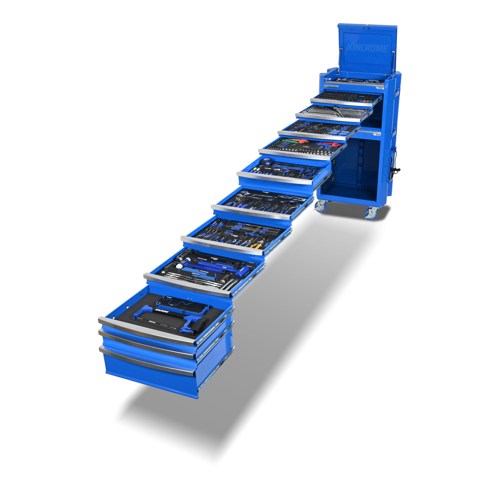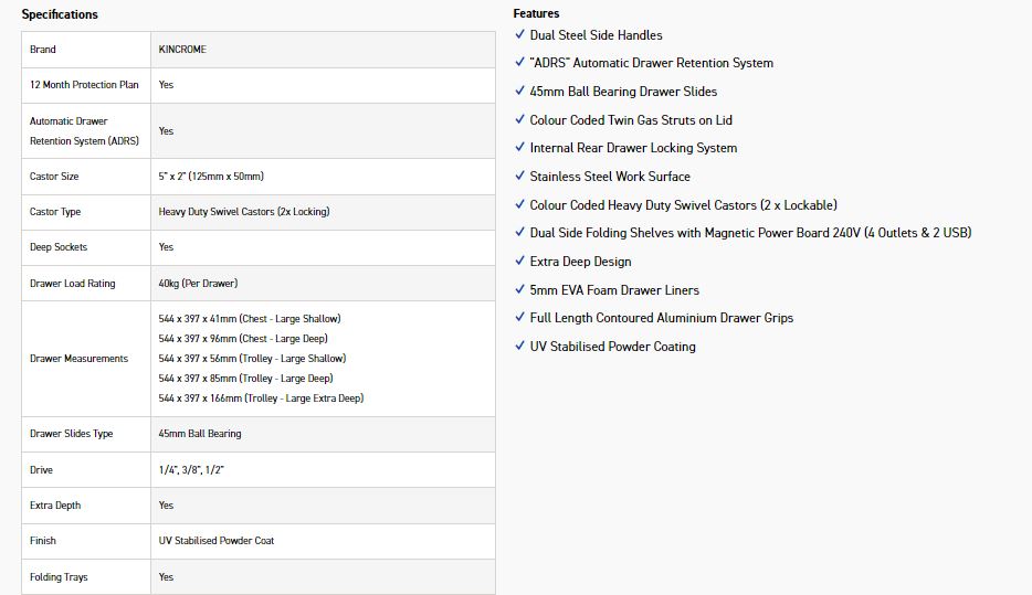CONTOURĀ® storage comes standard with a range of premium features, including; the chamfered screen printed Kincrome side panels, ’Automatic Drawer Retention System (ADRS)’ locking system, heavy duty steel side handles, side folding work trays (including magnetic power boards), stainless steel worktops & heavy duty swivel castors for easy manoeuvrability.