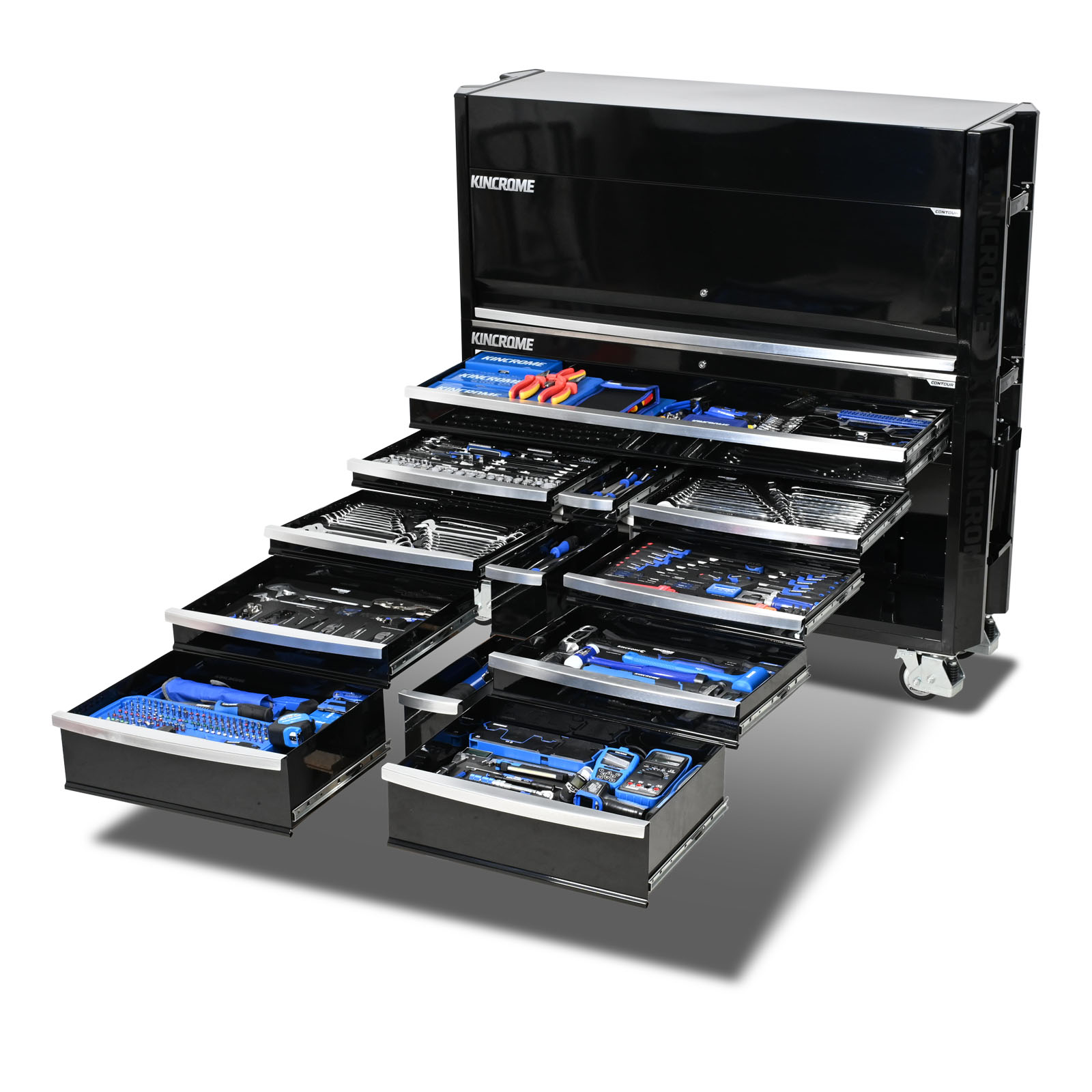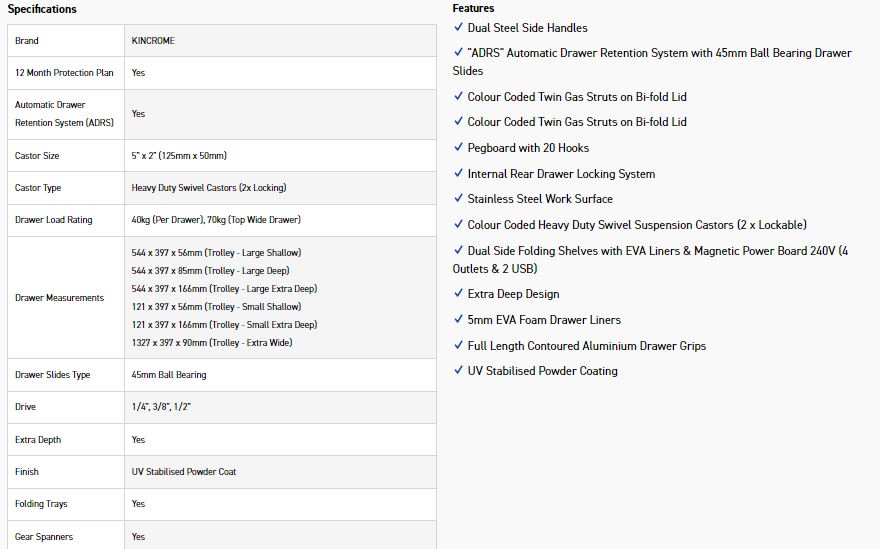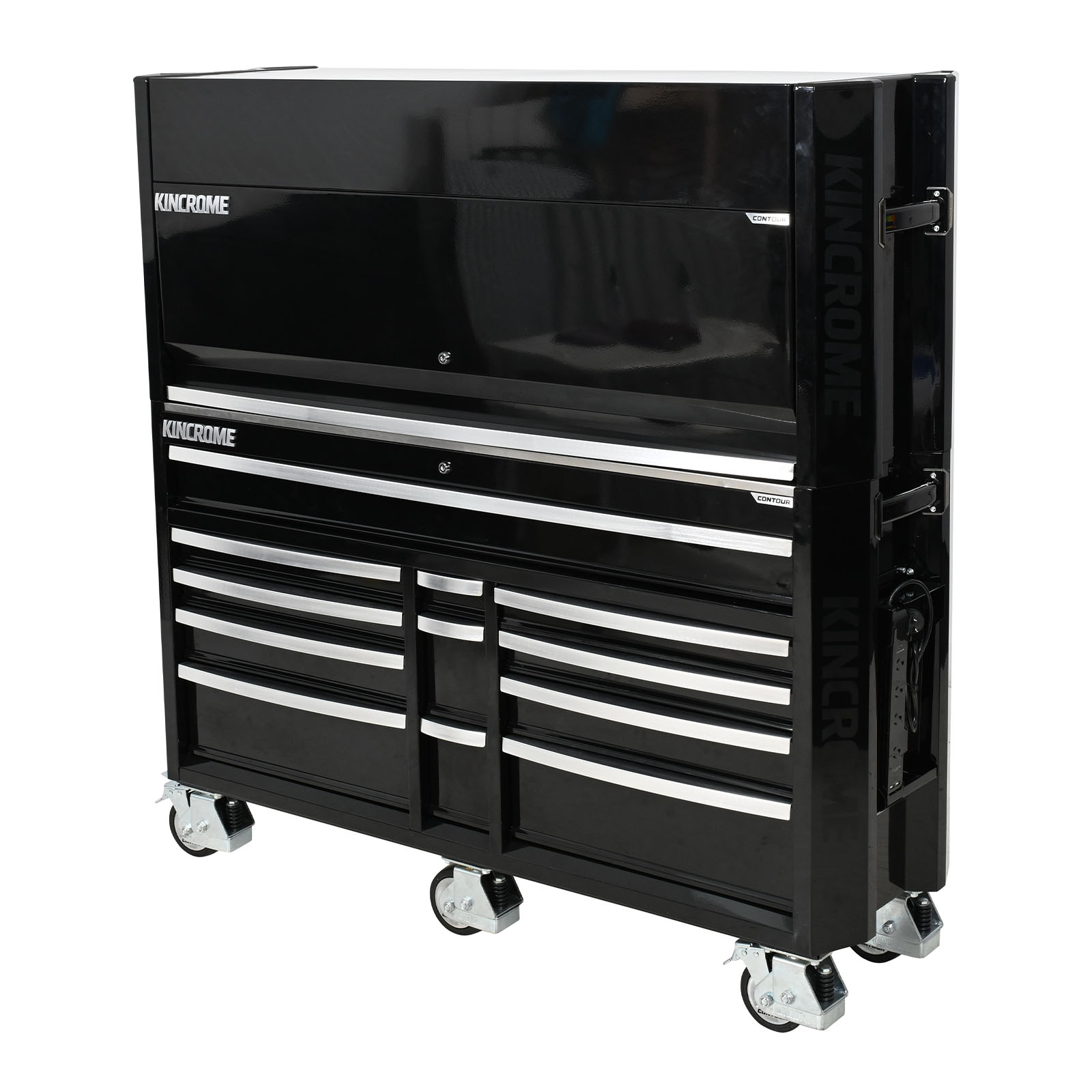 CONTOURĀ® storage comes standard with a range of premium features, including; the chamfered screen printed Kincrome side panels, ’Automatic Drawer Retention System (ADRS)’ locking system, heavy duty steel side handles, side folding work trays (including magnetic power boards), stainless steel worktops & heavy duty swivel castors for easy manoeuvrability.