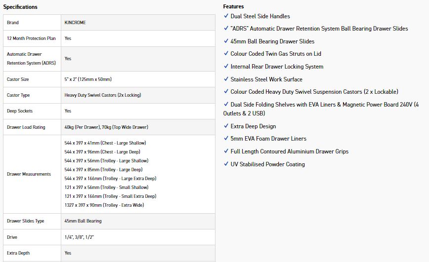 CONTOURĀ® storage comes standard with a range of premium features, including; the chamfered screen printed Kincrome side panels, ’Automatic Drawer Retention System (ADRS)’ locking system, heavy duty steel side handles, side folding work trays (including magnetic power boards), stainless steel worktops & heavy duty swivel castors for easy manoeuvrability.