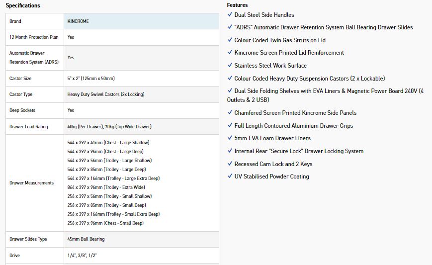 CONTOURĀ® storage comes standard with a range of premium features, including; the chamfered screen printed Kincrome side panels, ’Automatic Drawer Retention System (ADRS)’ locking system, heavy duty steel side handles, side folding work trays (including magnetic power boards), stainless steel worktops & heavy duty swivel castors for easy manoeuvrability.
