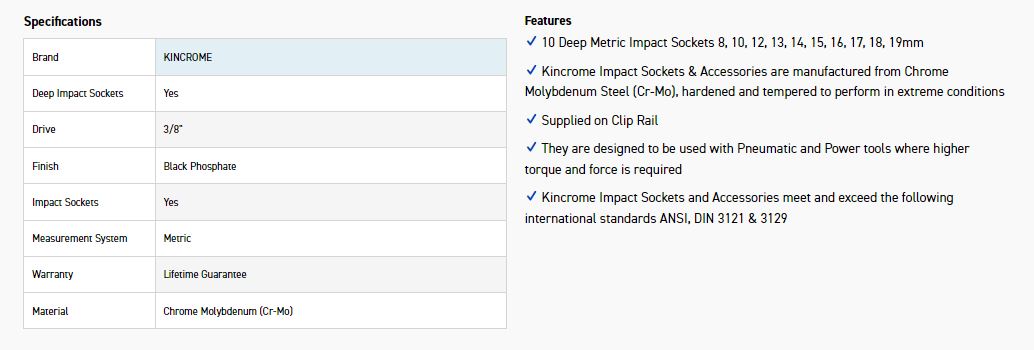 This 10 piece 3/8″ Drive Impact Socket Rail lives up to the quality that Kincrome prides itself on. Manufactured from Chrome Molybdenum (Cr-mo) steel, these sockets include an unbeatable lifetime warranty. With guaranteed toughness and Peripheral Drive Systemâ„¢ technology, Kincrome’s impact socket sets are an exceptional option for all things tough!
