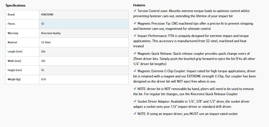 NOTE: driver bit is NOT removable by hand, pliers will need to be used to remove the bit. For regular bit changes, use the Kincrome Quick Release Coupler
