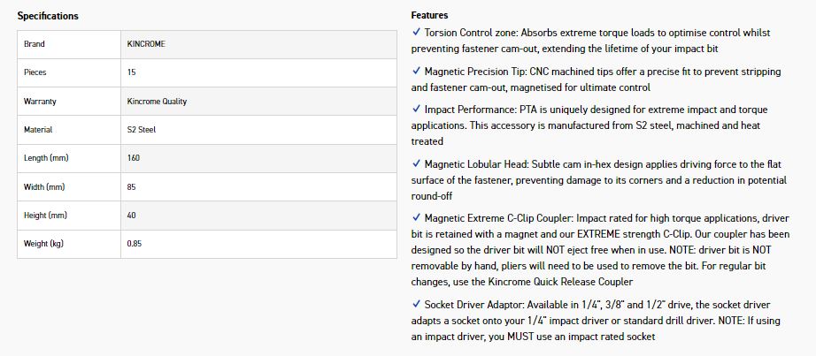 Magnetic Extreme C-Clip Coupler: Impact rated for high torque applications, driver bit is retained with a magnet and our EXTREME strength C-Clip. Our coupler has been designed so the driver bit will NOT eject free when in use. NOTE: driver bit is NOT removable by hand, pliers will need to be used to remove the bit. For regular bit changes, use the Kincrome Quick Release Coupler