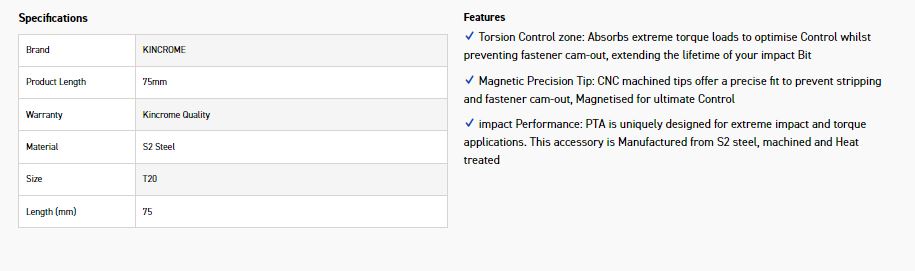 KINCROME K21124 IMPACT BIT TORX T20 75MM *30*
