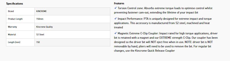 Magnetic Extreme C-Clip Coupler: Impact rated for high torque applications, driver bit is retained with a magnet and our EXTREME strength C-Clip. Our coupler has been designed so the driver bit will NOT eject free when in use. NOTE: driver bit is NOT removable by hand, pliers will need to be used to remove the bit. For regular bit changes, use the Kincrome Quick Release Coupler