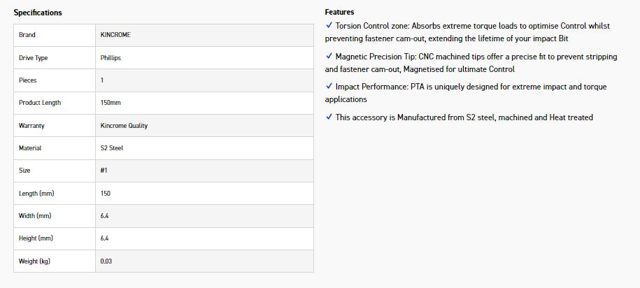 KINCROME K21228 IMPACT BIT PH#1 150MM 1 PCK