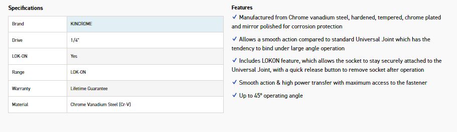 Home » Shop » HAND TOOLS » SOCKETS_SETS & ACCESSORIES » KINCROME K2126 LOKON UNIVERSAL JOINT 1/4D-45°