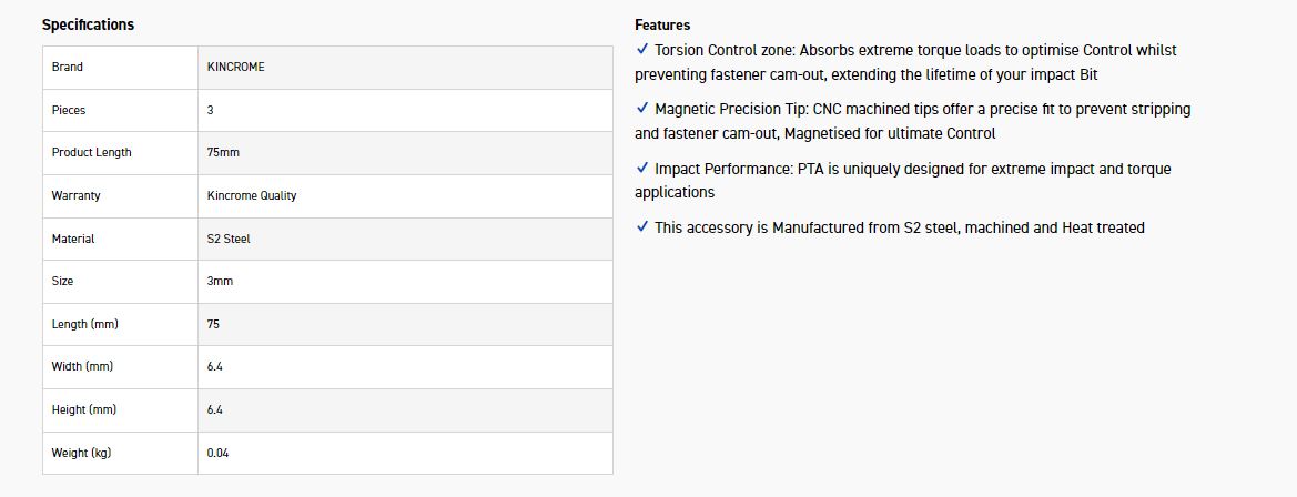 KINCROME K21325 IMPACT BIT HEX 3MM 75MM 3 PCK