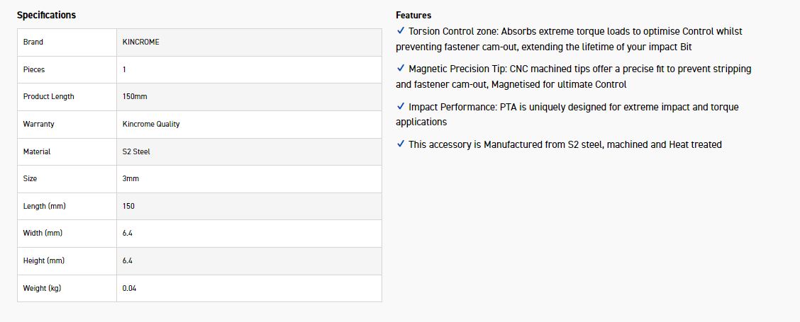 KINCROME K21327 IMPACT BIT HEX 3MM 150MM 1 PCK