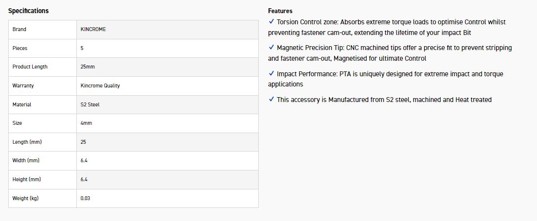 KINCROME K21329 IMPACT BIT HEX 4MM 25MM 5 PCK