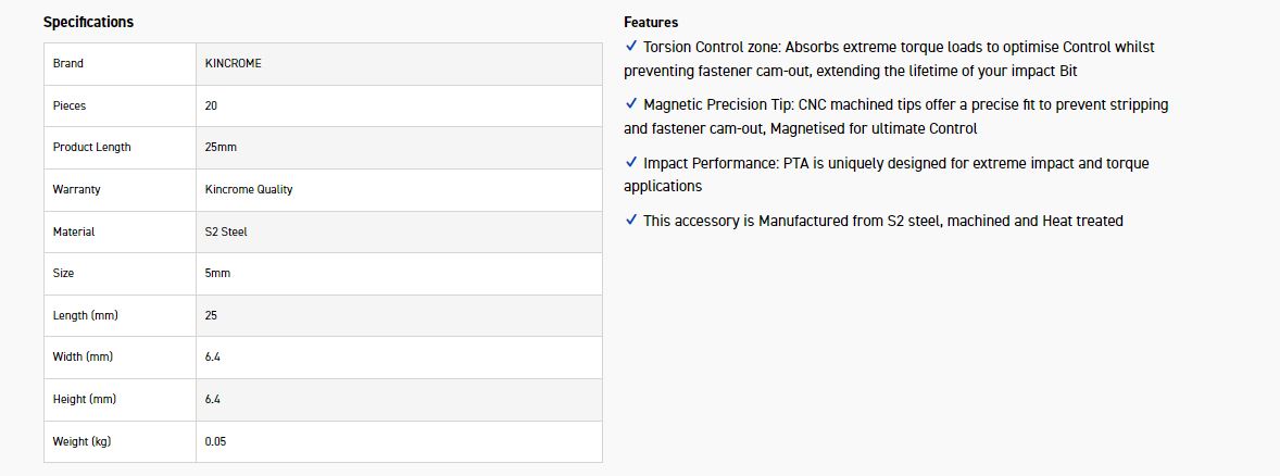 KINCROME K21340 IMPACT BIT HEX 5MM 25MM 20 PCK