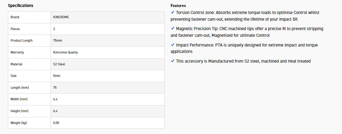 KINCROME K21350 IMPACT BIT HEX 5MM 75MM 3 PCK