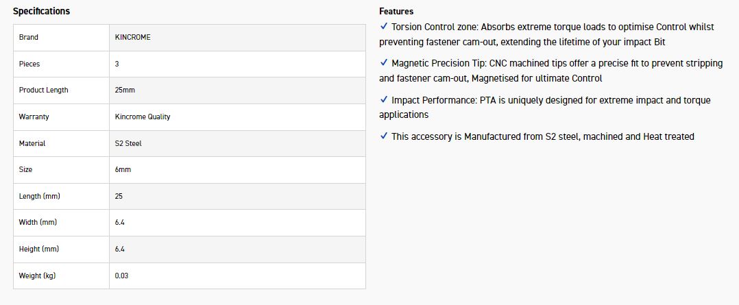 KINCROME K21359 IMPACT BIT HEX 6MM 25MM 3 PCK