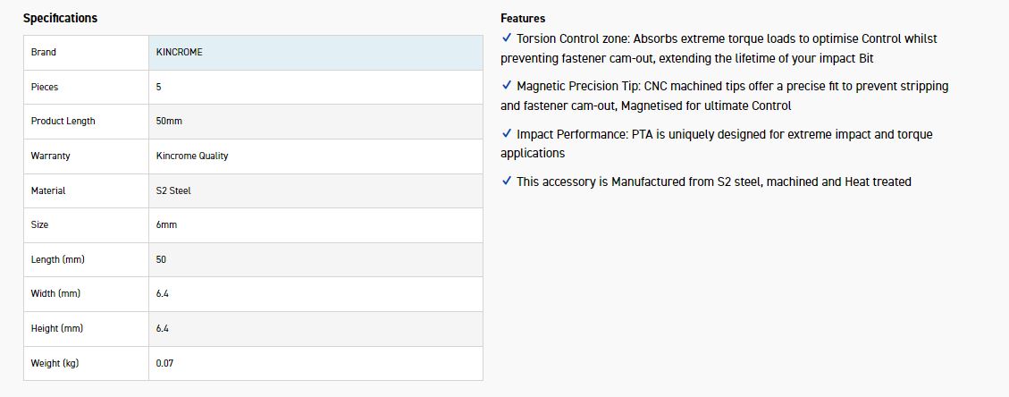 KINCROME K21362 IMPACT BIT HEX 6MM 50MM 5 PCK