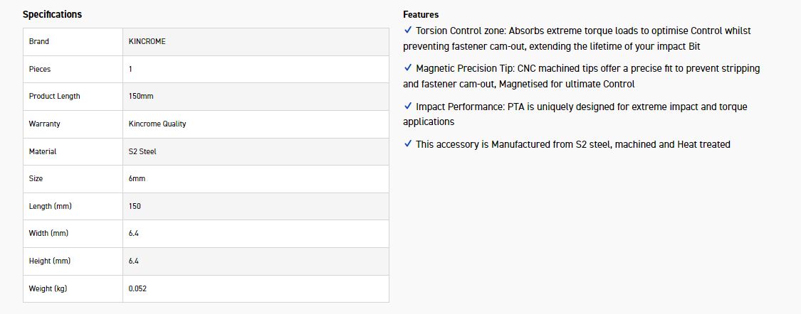 KINCROME K21367 IMPACT BIT HEX 6MM 150MM 1 PCK